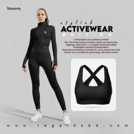 Product: Stunning 3-piece workout combo set: sports bra, leggings, and full-shirt (appears to be a zip-up top/jacket).